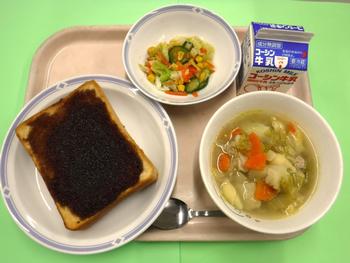 1年生は学校の給食に慣れるため、4/9(木)~4/14(火)の間、品数を減らした簡易給食としています。本日1年生には、ココアトーストと春キャベツのポトフを提供しています。