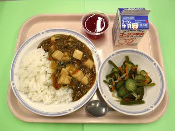 1年生は学校の給食に慣れるため、4/9(木)~4/14(火)の間、品数を減らした簡易給食としています。本日1年生には、麻婆豆腐ライスとグレープゼリーを提供しています。