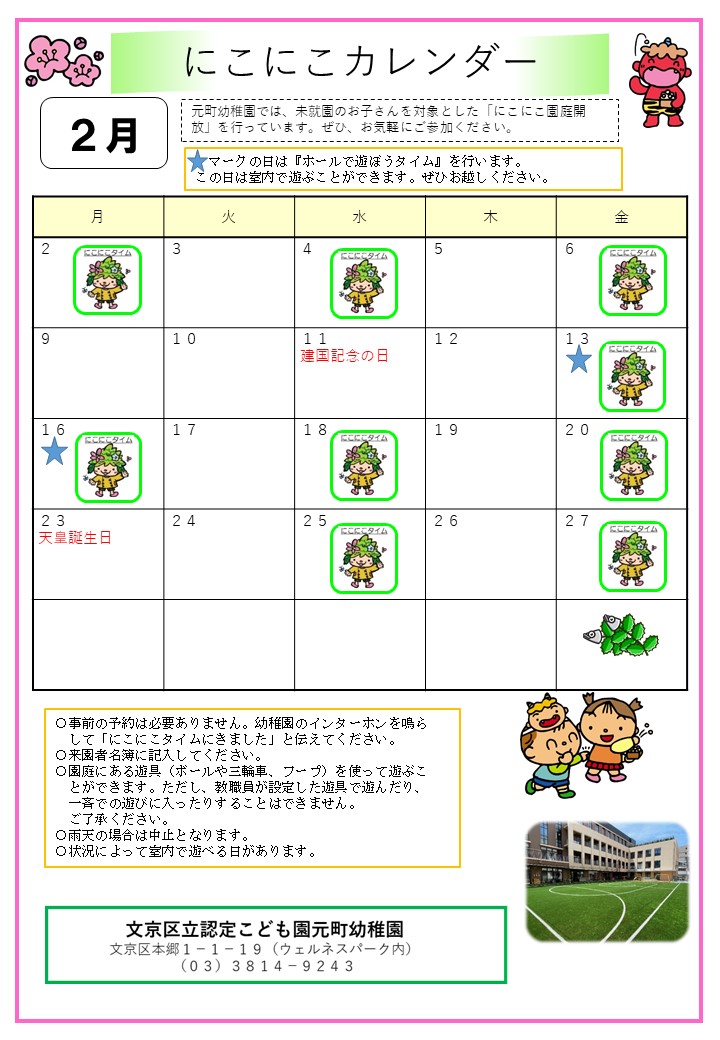 にこにこタイム(未就園児対象)2月の予定が決まりました。
