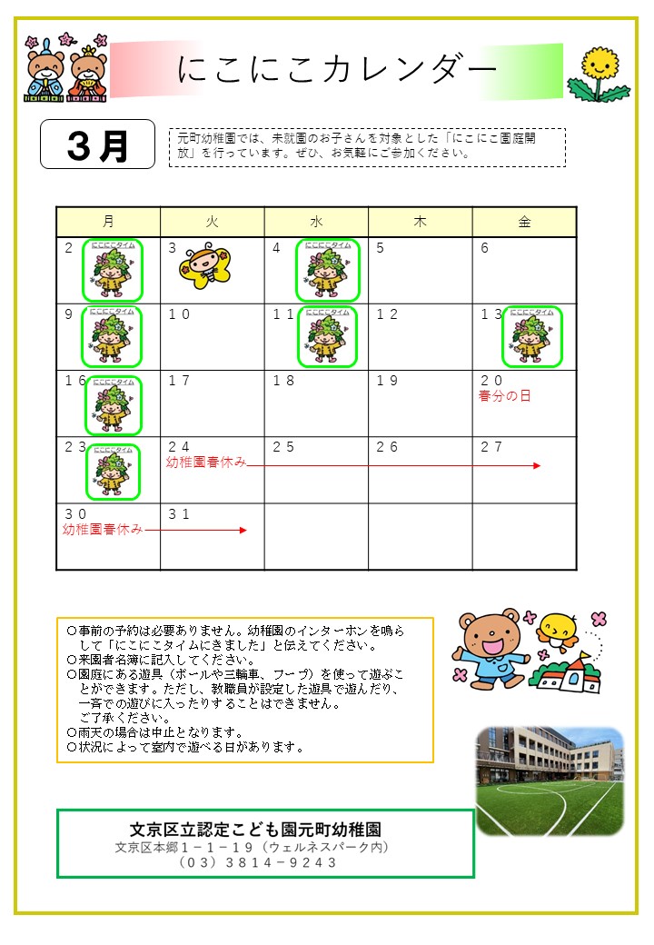 3月のにこにこタイムの予定です。元町幼稚園では園庭を開放しています。時間は9時30分から11時です。雨天の場合は中止となります。PDFはこちら20260217-144555.pdf [ 300 KB pdfファイル]