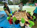 5歳児ほし組では親子で「猛獣狩り」の遊びをしました。言われた動物の名前の文字数の人数で集まるゲームです。大人数がいる中で、ピッタリの数で集まるのはなかなか難しいですが、「こっちが空いているよ!」と周りを見ながら、考えて動いていました。また後半は親子対抗のリレーも行いました。白熱した勝負に勝ったのは…子どもチーム!大喜びのほし組でした。