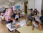 4歳児はな組は親子で一緒に製作遊びを楽しみました。牛乳パックと輪ゴムを使って、ピョンと跳ねるパッチンガエルと、ストローと画用紙の輪を組み合わせて作る飛行機を作って遊びました。「どうやったら跳ぶかな?」と親子で考えながら作ったり、「飛行機、飛んだよ!」と嬉しい歓声が上がったりしていました。