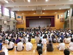 全校児童がミニオーケストラ会場に変わった体育館に集まり、オーケストラの迫力を間近に感じながらアンコールを含め6曲の演奏を聴きました。