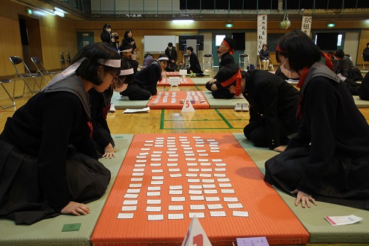 全校生徒による百人一首大会が行われました。紅組対白組対抗戦で前半戦が終了した時点では紅組がリードしていました。