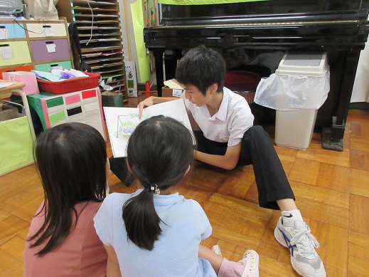 1年生にとっては初めての絵本の読み聞かせでした。 戸惑うこともあったでしょうが、園児と楽しい時間を過ごせたのではないでしょうか。