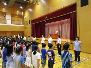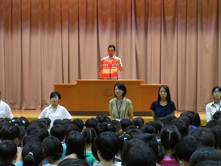 朝会の時間に体育館でプール開きの式を行いました。