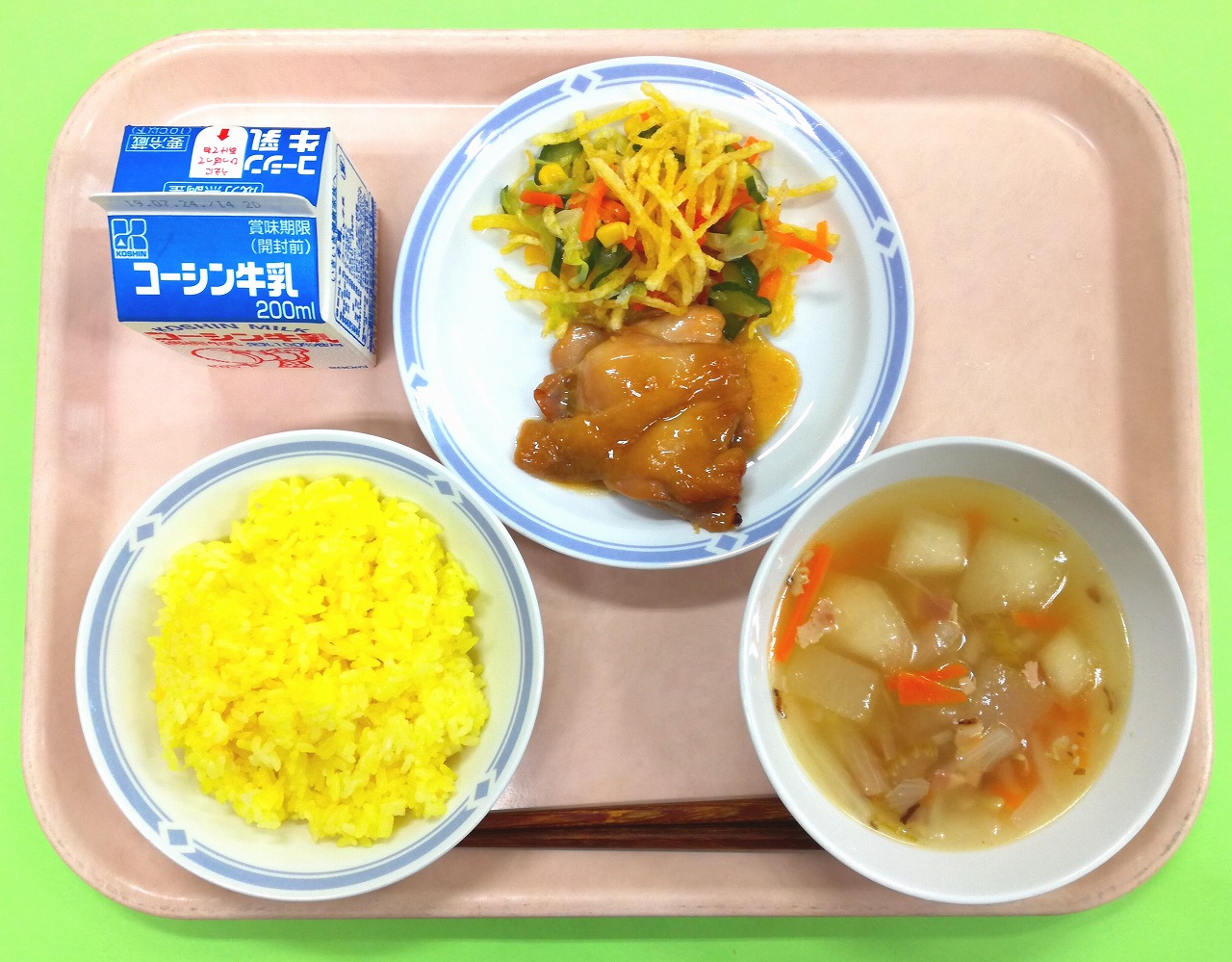 【 ターメリックライス・鶏肉のマーマレード焼き・ポテトのハニーサラダ・冬瓜のスープ・牛乳 】