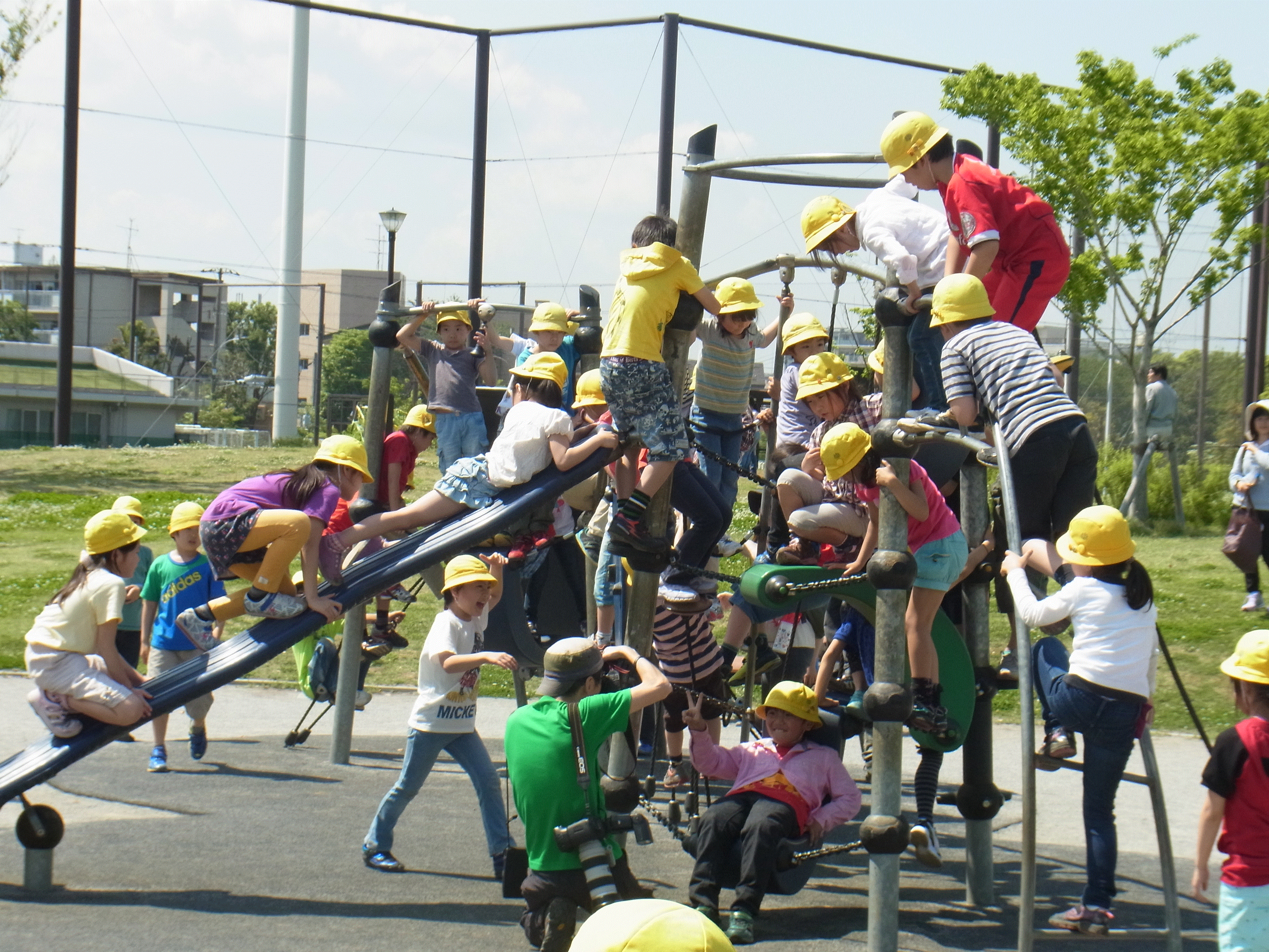 子どもたちは、遊具で元気に遊んでいるところです。この後は、楽しみにしている、お弁当タイムです。