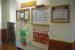 昨日の空模様とは打って変わって、今朝は真っ青な晴天です。校長室に入ってみると、昨日「礫川おやじの会」のみなさんが作ってくださった鏡餅が置いてありました。早速用務主事さんに飾りつけをしてもらい、玄関にかざりました。これでお正月を迎える準備がひとつできました。おやじの会のみな様、ありがとうございます。礫川小学校はあと9日で冬季休業を迎えます。お正月の前にはこんなお楽しみもありますね。放送室前の廊下に素敵なコーナーがあります。その先にある給食の掲示板もわくわくします。これは季節や行事に合わせて図書館専門員や栄養士が作成しています。「冬休みチャレンジレシピ」は冬休みに大活躍しそうです。