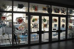 礫川小学校はいよいよ明日から展覧会が始まります。正門からは2年生の作品がステンドグラスのように美しく見えます。(写真は廊下から撮影しているので、実物はぜひご来校の際に正面からご覧ください。)会場の体育館は礫川美術館となり、みな様のご来場を待ち構えています。