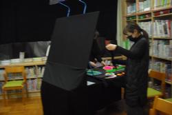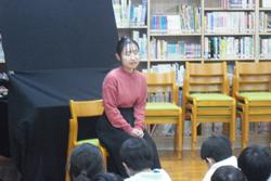 今日は「おはなし会」の二日目です。午前中には高学年、午後は4年生が鑑賞しました。リハーサルの時間に楽屋裏をのぞかせていただきました。パネルシアターでは、挿絵をお話の進行に合わせてタイミングよく掲示していくのですが、高学年と中学年で違うお話なので、それぞれボードに分けてご準備されていました。昨日同様、ブラックライトの中ではうまく写っていませんでした・・。そして、上手の朗読ブースではこんなに大勢の方々が登場人物や語り手、BGMや効果音の担当として活躍されていました。おはなしの世界に浸った子供たち、これからの読書に民話のジャンルも広げていってほしいと思います。図書ボランティアのみなさん、ありがとうございました!