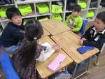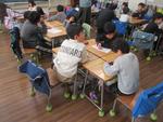 生活科では、周年に向けた制作を始めました。学級の枠を超えてそれぞれが調べたい場所でグループを作り、話し合いをしました。どのグループも話をしながら、プリントに予想や考えたことを記入していました。また、紙コップと丸シールを使って、110周年記念式典のお客様に向けての製作もしています。出来上がりは、当日までお楽しみです。