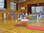 跳び箱の学習が始まりました。5年生では、伸膝台上前転と頭はね跳び、かかえこみ跳びができるようになることが目標です。