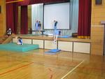 マット運動では、苦手な技について友達とアドバイスし合いながら練習したり、練習に必要な場の設定を考えたりしながら運動しています。