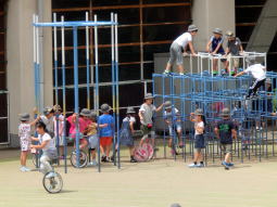 月・火と梅雨空が続く中、今日の20分休みは太陽が見え、低学年の子供たちが一斉に校庭に飛び出していきました。みんな思い思いに、友達と遊んでいました。昨年、新たに購入した一輪車。登り棒のところでよく遊んでいるようです。