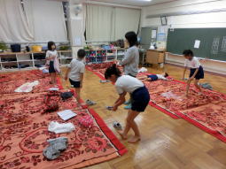 毛布の片付けは、端っこを揃えて畳むのが一苦労。そんなときは、互いに助け合うとうまくいきます。「もしも」の時は、「助け合う」ことが大切。ちょっと一苦労なこともスイスイとうまくいきます。