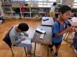 今日も雨。なかなか梅雨が明けません。こんな雨の日、子供たちは何をしているか、2年生の教室を訪問してみました。色紙、お絵かき、本読み、トランプと、友達を誘いながら、思い思いに落ち着いて楽しそうに過ごしていました。こんな雨の日の穏やかな子供たちの笑顔。とてもいいですね。