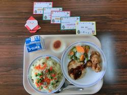 冬休みまであと二日。そして、クリスマスイブ。晴れた朝、子供たちも元気に登校。今日の給食は、「クリスマス献立」で、クリスマスらしくカラフルなメニュー。味だけではなく、見た目も楽しんで食べてもらいたいという栄養士さんや調理員さんたちの願いがこもっています。また、メインのおかずは、「フライドチキン」か「ハンバーグ」のうち、一人一人が選べるようになっています。給食に添えられた「クリスマスカード」は、栄養士さんや事務主事さんたちが、ずいぶん前から全校の子供たち一人一人の「名前」を入れながらの手作りカードです。そして、一人一人に渡されたメッセージも異なります。そんな気持ちのこもった「クリスマス献立」、楽しんでもらえたかな?
