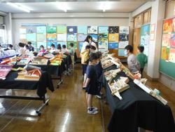 ◇3階 図書室 1年生 平面「はってかさねて」、立体「おってたたせて」、立体「カラフルウォーター」 平面では、お花紙という柔らかい素材の良さを生かしながら、立体では紙の特徴を生かして追ったり曲げたりして、自分の表現したいものをのびのびと作りました。 2年生 平面「ザリ・カメさんといっしょに」、立体「ギュッと!したいおともだち」、立体「すけるんたんじょう!」 平面では、教室で飼っていた生き物としたいことを想像して、立体では、クラフト紙やクリアファイルなどの新しい素材の生かし方をよく考えて、自分の表現したいものを生き生きと表現しました。 |