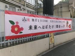 本日、開校100周年の横断幕を、学校の柵に取り付けました。100周年記念キャラクターの「しいくん」や、本校の校歌の歌詞に出てくる「椿の花」があしらわれています。明日の土曜授業公開で見ていただけると思います。