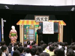 校長の佐藤です。子供たちに多様な体験活動を…という趣旨で、都教委が令和5年度から取り組んでいる「笑顔と学びの体験活動プロジェクト」。昨年度は横山だいすけお兄さんと、落語家や漫才師の皆様が来校して楽しいステージを見せてくれました。今年度は人形劇団ひとみ座の皆様が来校してくれました。3・4校時に1~3年生が「ふしぎ駄菓子屋銭天堂」を見せていただきました。「銭天堂」は子供たちに最も人気のある書籍。人形たちが繰り広げる迫力ある展開に、子供たちは食い入るようにして夢中になって見ていました。劇が終わってから、「人形劇のひみつ」ということで、実際に人形をどう操っているのかを教えていただき、6人がかりで操演する場面も再現していただきました。やはり「生」のものは迫力があっていいですね。楽しい時間を過ごしました。