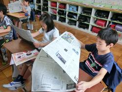 また、4年生は、「新聞に親しもう」というテーマで新しい学習に取り組み始めました。今日は、各自に配布された、各社の新聞をそれぞれみながら、「新聞のつくり」について気づいたことを話し合いました。2学期が始まって3日。各学年それぞれ「実りの秋」に向けて動き始めました。