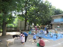 「一日動物村」で園庭に動物たちがたくさんやってきました。ヤギやウサギなどとゆっくりと触れ合い、親しみを感じていました。