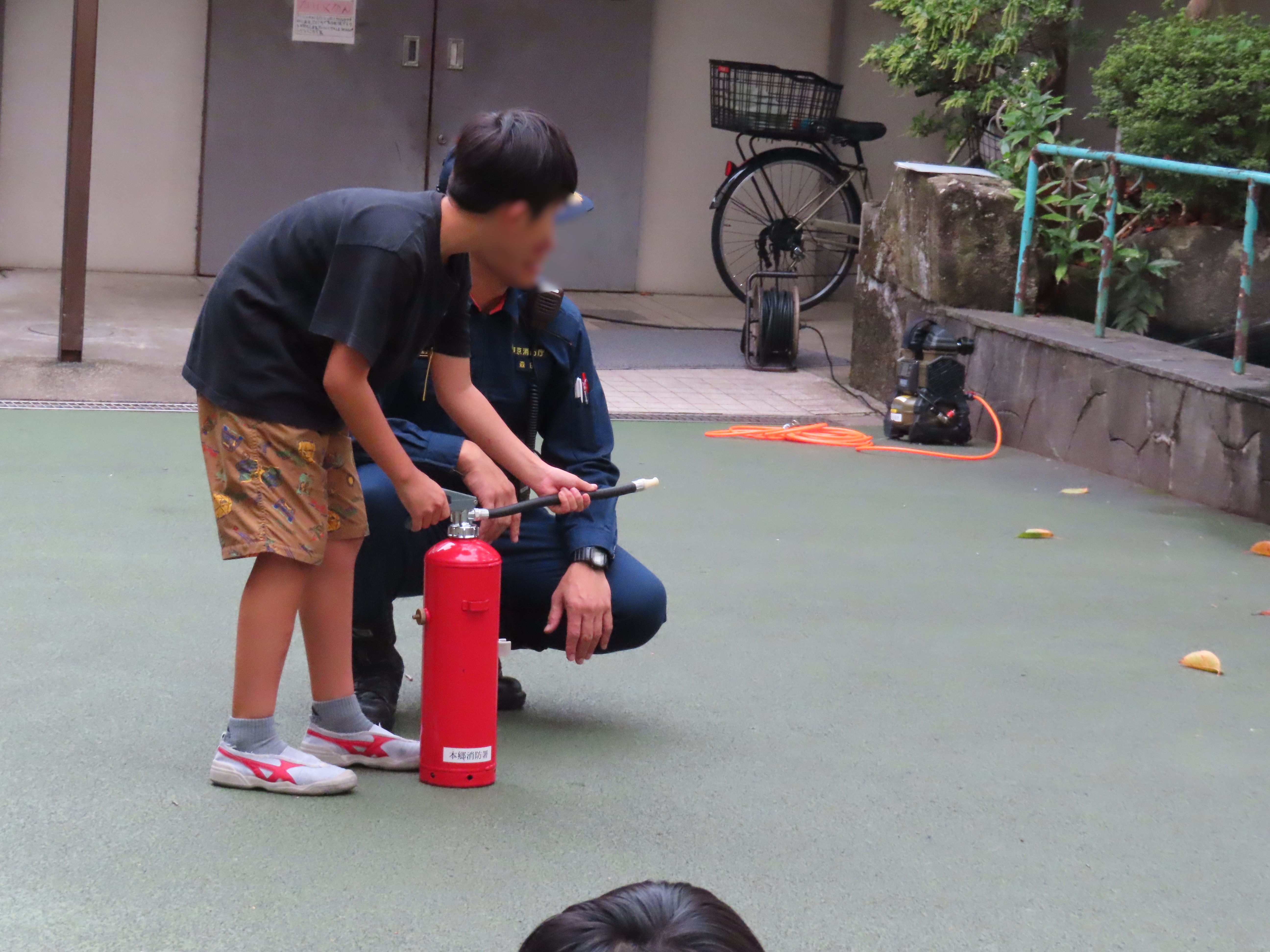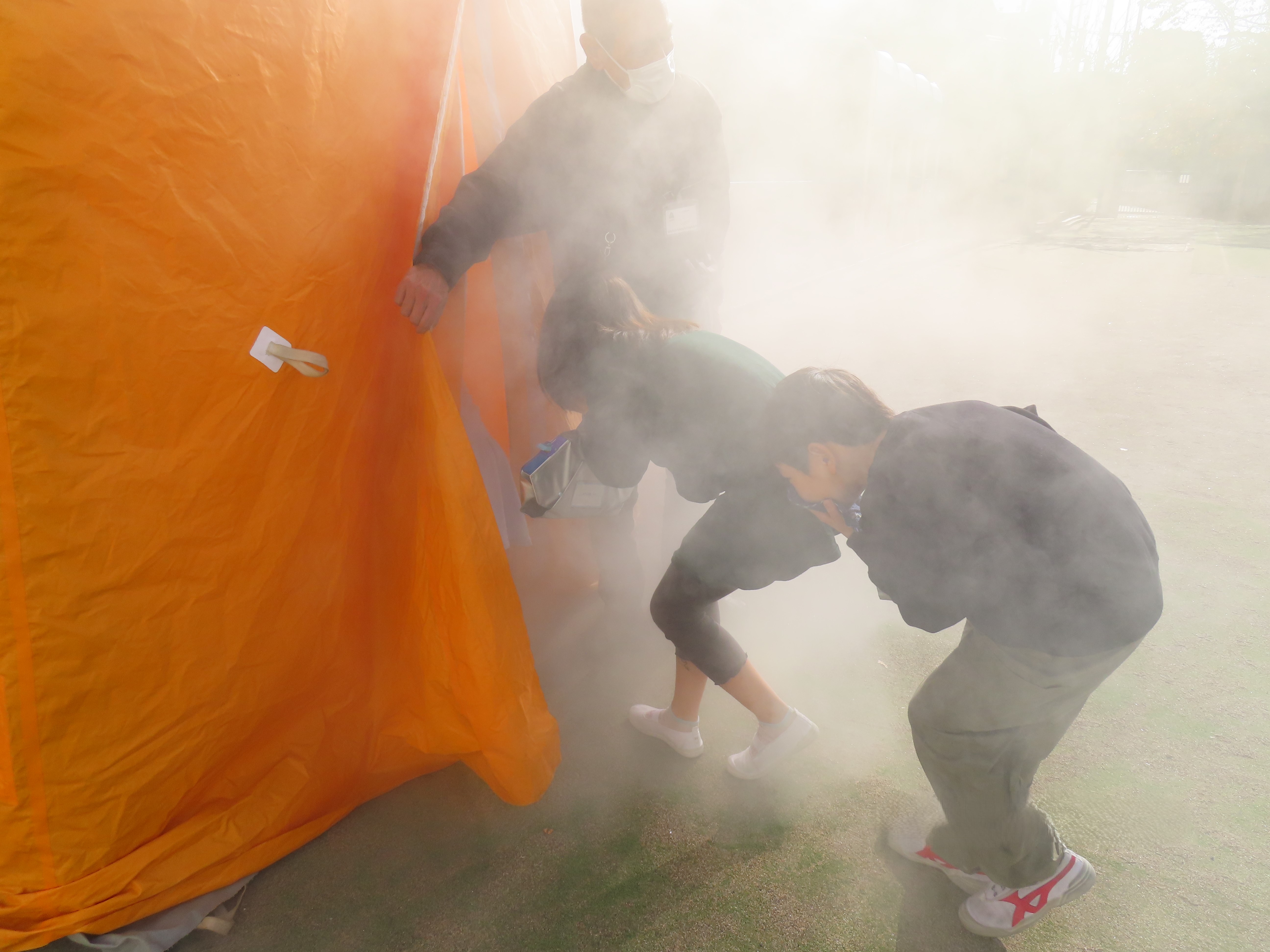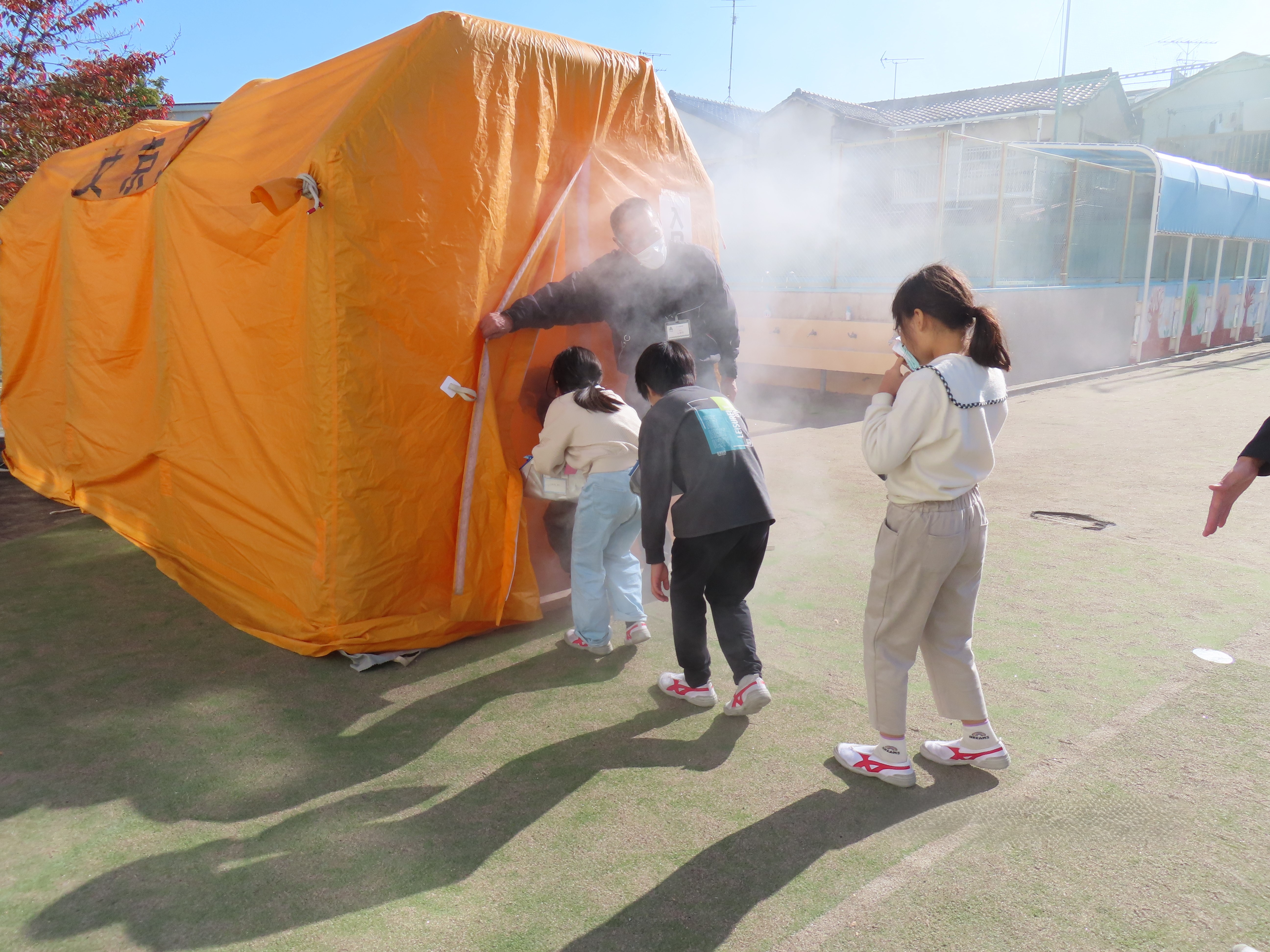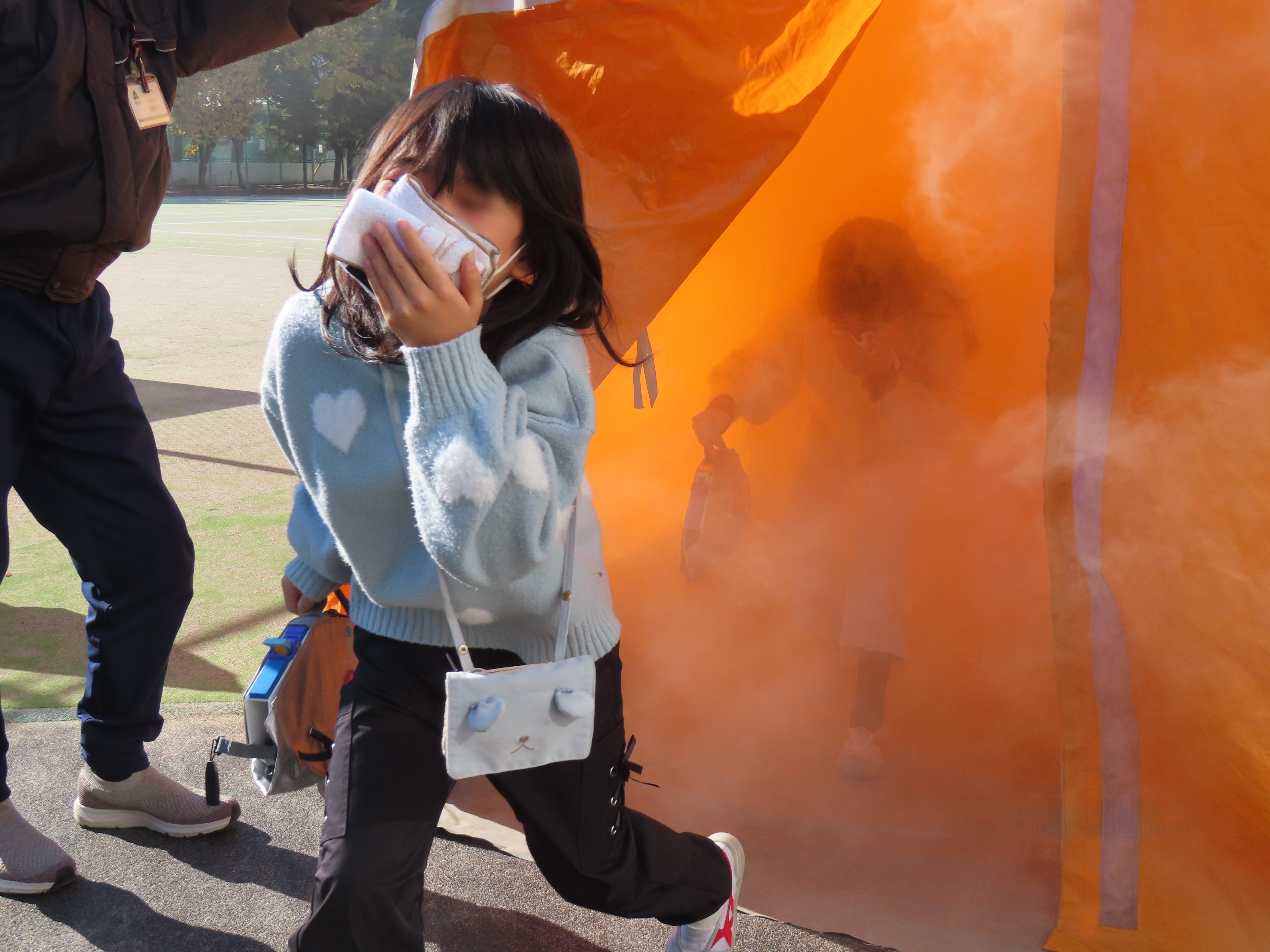 地震と火事を想定した避難訓練の後、3・4年生は煙体験を行いました。