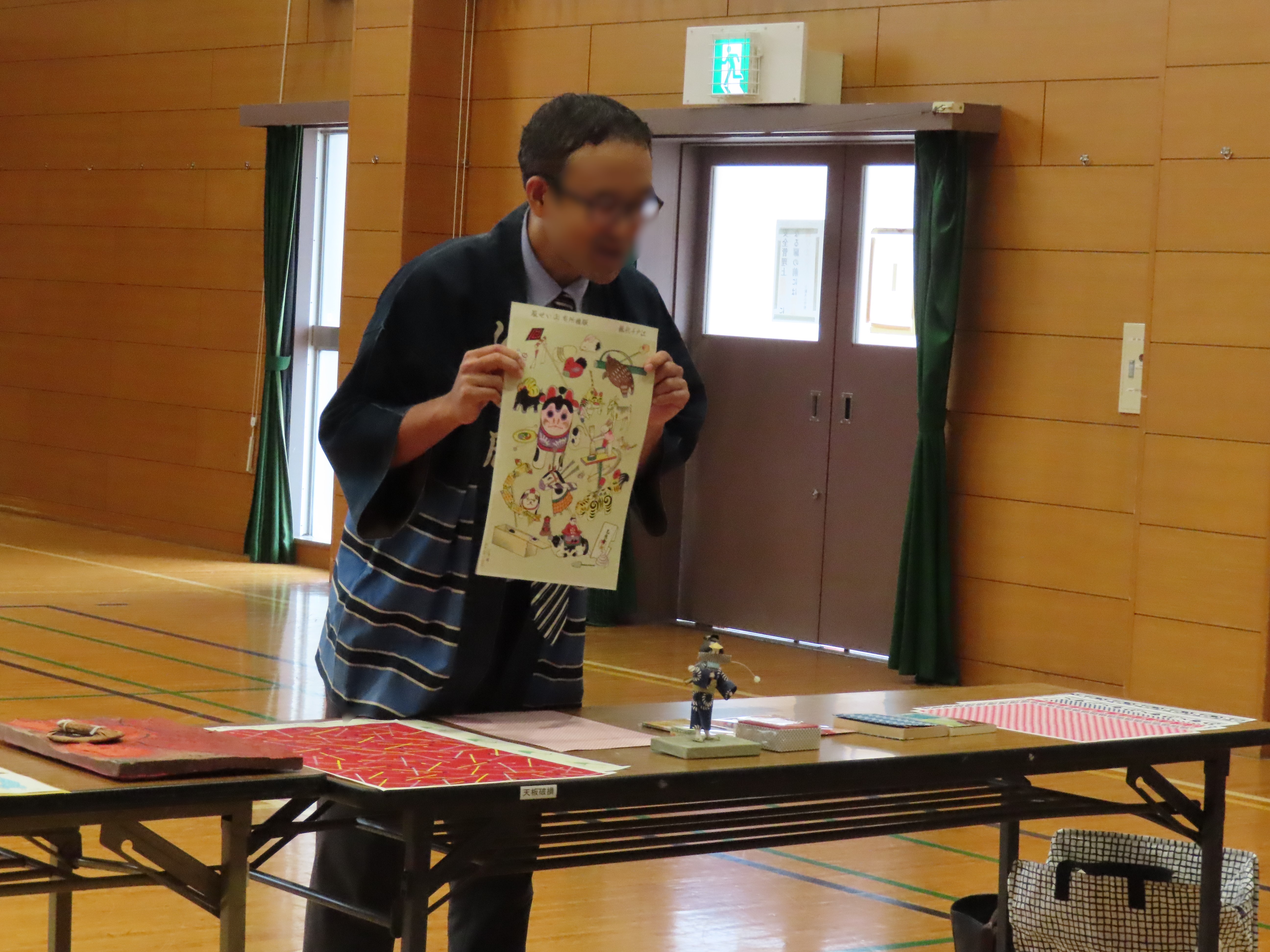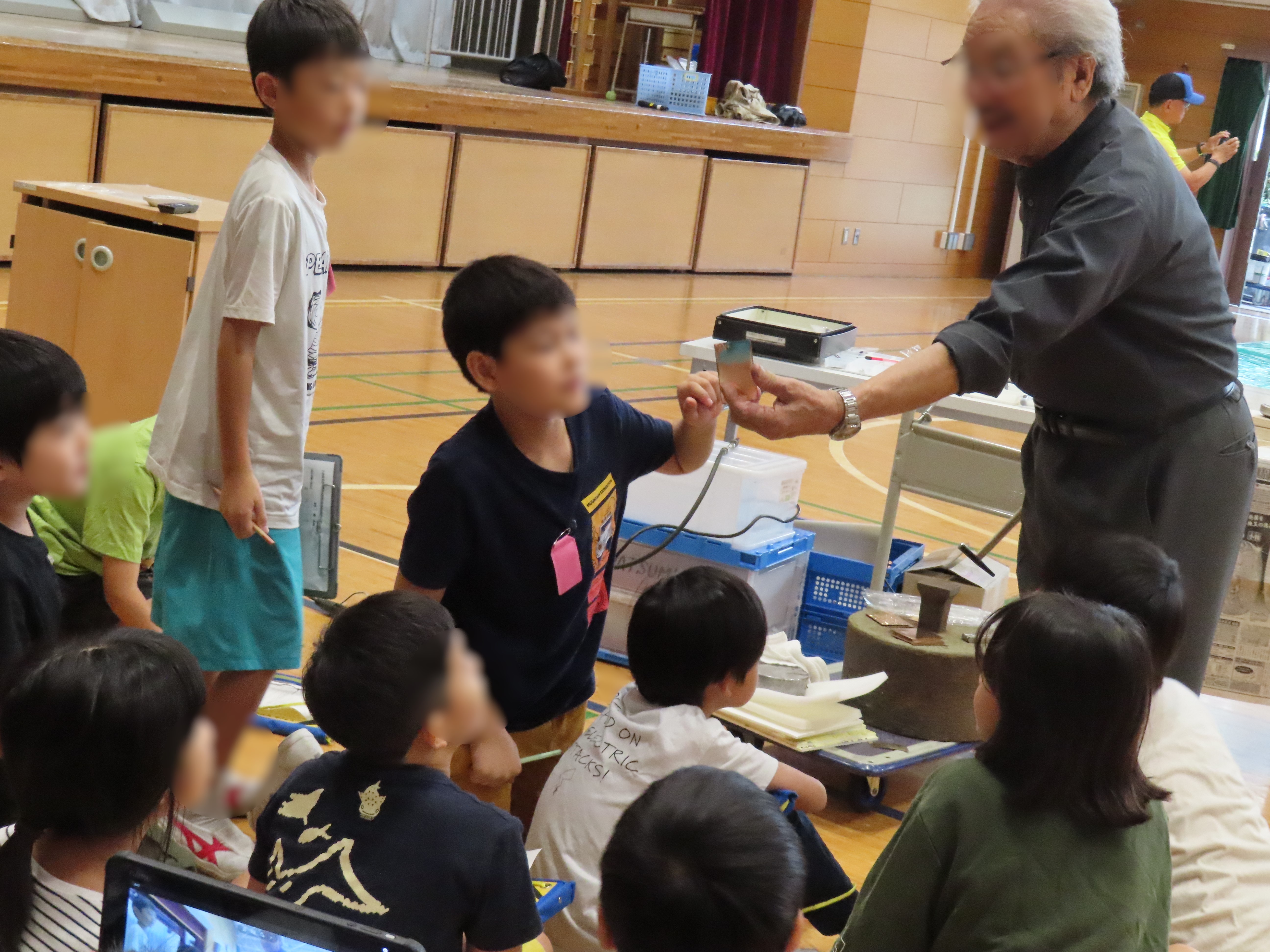 本校の体育館で「いせ辰」さん、「原田左官」さん、「松美銀器」さん、「飴細工吉原」さんをお呼びして