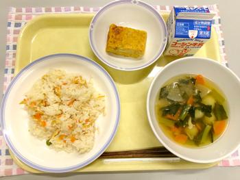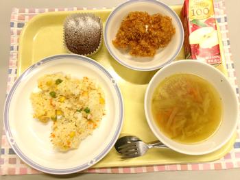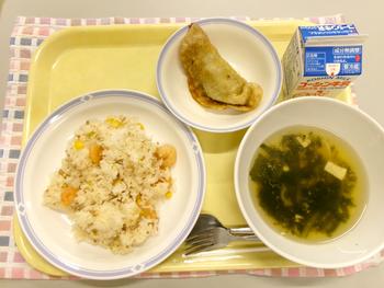 今日の献立 ・えびチャーハン ・ジャンボあげぎょうざ ・まるごとわかめスープ ・牛乳 |