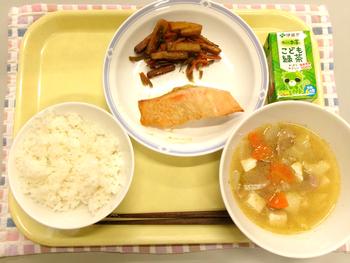 今日の献立 ・ごはん ・さけの西京焼き ・さつまいものきんぴら ・豚汁 ・お茶 |
