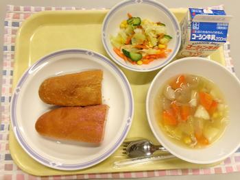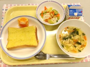 今日の献立 ・おさつトースト ・マスタードサラダ ・ふわふわたまごスープ ・みかん(はれひめ) ・牛乳 |
