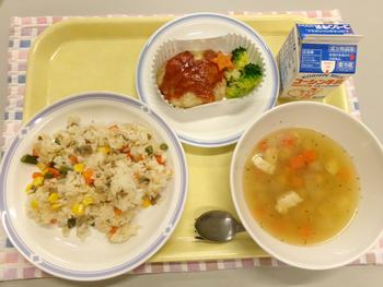今日の献立 ・ツナピラフ ・チーズパンバンーグ ・豆コロスープ ・牛乳 |