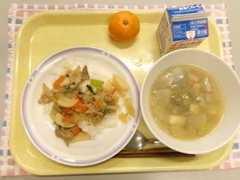 今日の献立 ・かまぼこ丼 ・いものこ汁 ・みかん ・牛乳 |