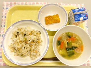 今日の献立 ・菜飯 ・いかの竜田揚げ ・ごまみそ汁 ・牛乳 |