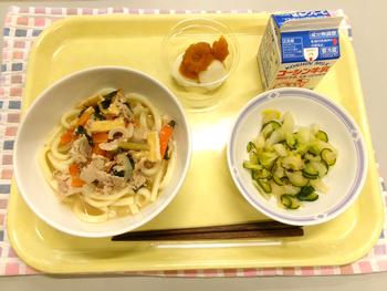 今日の献立 ・みそ煮込み風うどん ・ゆず香あえ ・白玉団子のかぼちゃあん ・牛乳 |
