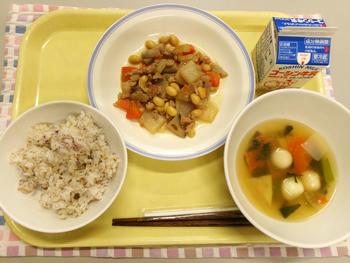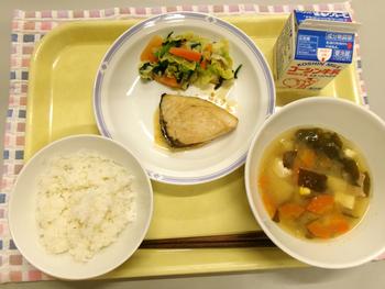 今日の献立 ・ごはん ・とろぶりの照り焼き ・練りごまあえ ・どさんこ汁 ・牛乳 |