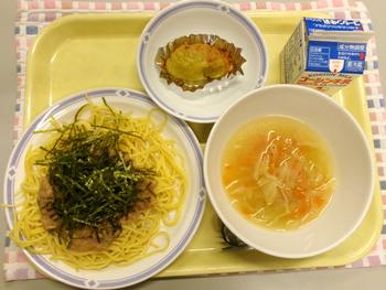 今日の献立 ・大根スパゲッティ ・ジュリアンスープ ・スイートポテト ・牛乳 |