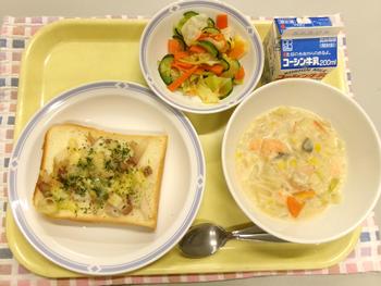 今日の献立 ・ベーコンねぎチーズトースト ・ホワイトシチュー ・キャロットドレッシングサラダ ・牛乳 |