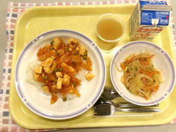今日の献立 ・えびと豆腐のチリソース丼 ・春雨サラダ ・ももかん ・お茶 |