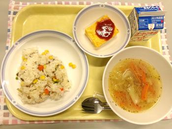 今日の献立 ・コーンピラフ ・スパニッシュオムレツ ・ABCスープ ・牛乳 |