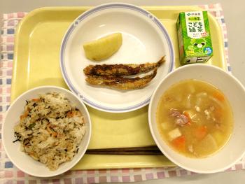 今日の献立 ・ひじきごはん ・ししゃもフライ ・豚汁 ・りんご ・お茶 |
