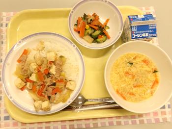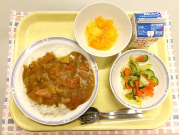今日の献立 ・カレーライス ・オニオンドレッシングサラダ ・フルーツミックス ・牛乳 |