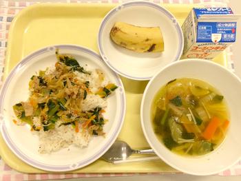 今日の献立 ・TOKYO Xのの小松菜キムチ丼 ・白菜スープ ・バナナ ・牛乳 |