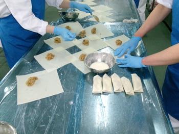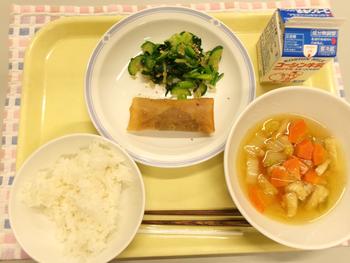 今日の献立 ・ごはん ・もんじゃ春巻き ・小松菜のたくあんあえ ・ちゃんこ汁 ・牛乳 |