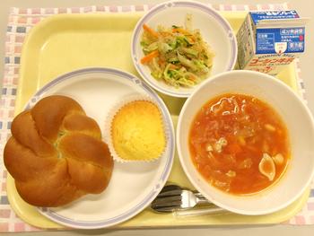 今日の献立 ・明日葉パン ・糸寒天サラダ ・大豆のミネストローネ ・八丈フルーツレモンケーキ ・牛乳 |