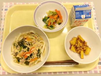 今日の献立 ・かきたまうどん ・おかかあえ ・大学豆いも ・牛乳 |