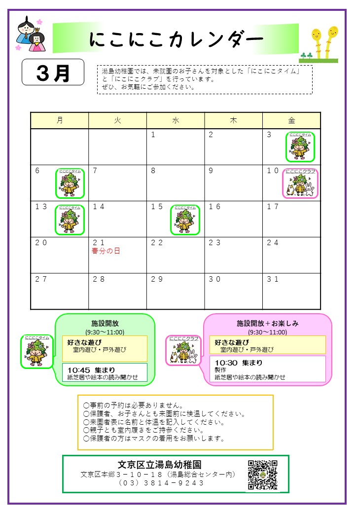 3月のにこにこタイム(未就園児対象)の日にちが決まりました。