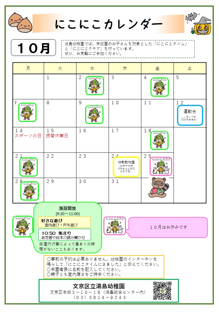 10月のにこにこタイム(未就園児対象)の日にちが決まりました。