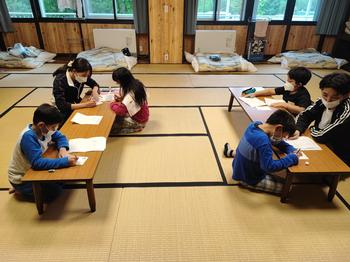 入浴の後は、部屋ではがき書きをしました。みんなそれぞれに送りたい相手のことを思いながら文章を考えて丁寧に書き、学園にある郵便ポストへ投函しました。夜は、礫川小学校、柳町小学校、林町小学校、汐見小学校とレク集会を行いました。司会進行を湯島小学校が担当し、「まねっこゲーム」や「ジェスチャークイズ」、「ペットボトルダーツ」などを通して交流を深めました。